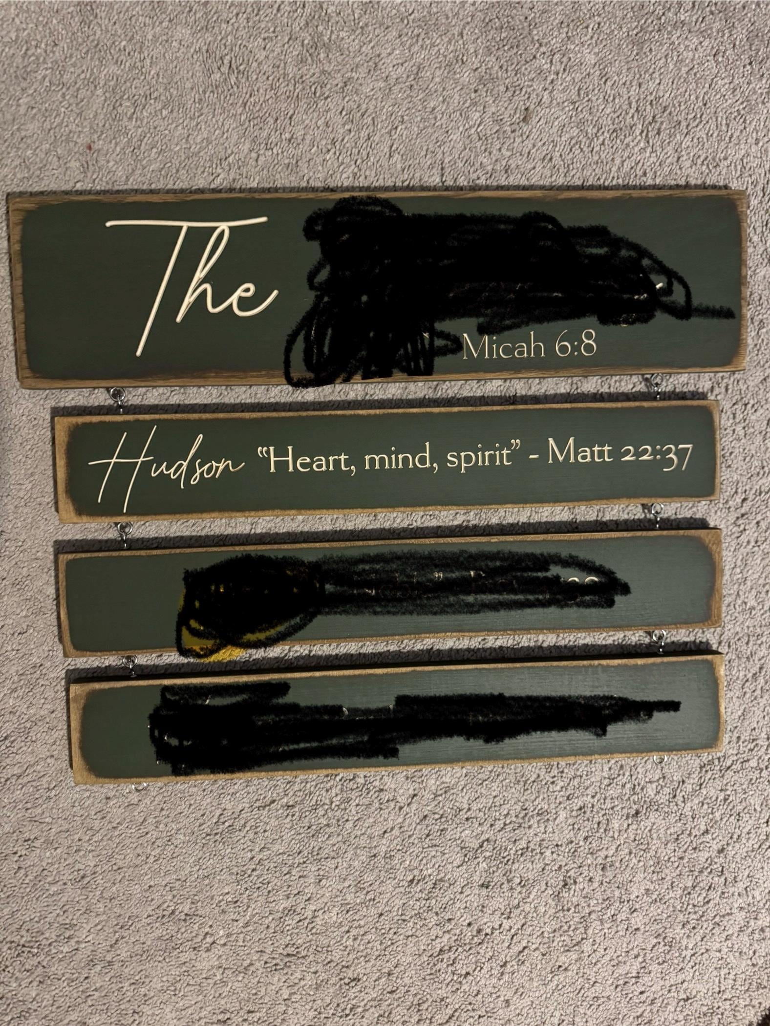 I hardly ever write reviews, but this family sign actually made my jaw drop when I opened the box. I requested a different format with scriptire/name meanings added to it, and Kari included it all in the regular price. I can’t believe how beautiful it came out. To find something in solid wood, with BEAUTIFUL custom engravings like this…. It’s something I dreamed of, and even after I saw the proof online, I didn’t expect it to be this beautiful in person. We are so grateful for this sign that captures our family’s Bible verse, and our three children’s names/meanings/Bible verse. I plan to surprise my husband with it at Christmas, and I just know he is going to be thrilled with it! Thank you for creating this custom piece for us Kari!!